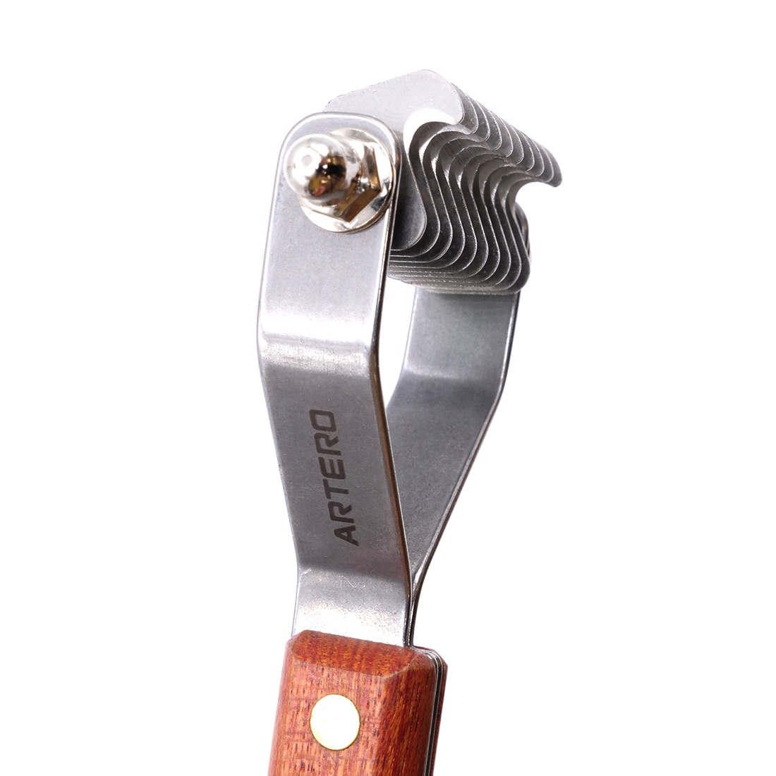 Sujetar por el mando, presentar la punta de las hojas sobre el manto y deslizar a favor de pelo arrastrando el subpelo. Eliminar el exceso de pelo entre las hojas con la mano.