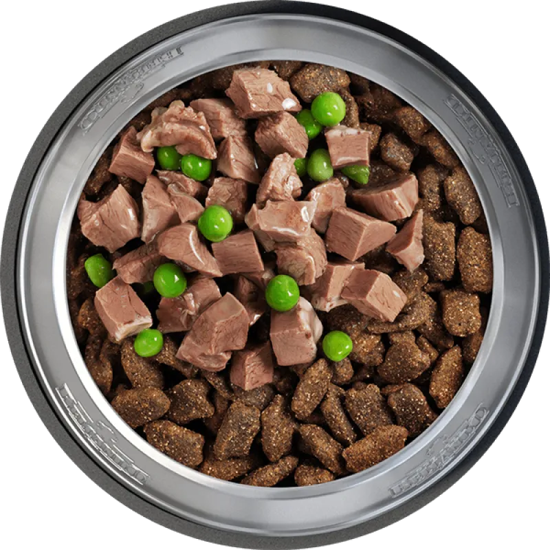 carne de cordero libre de grasa (50 %); caldo de carne de cordero (44 %); guisantes (6 %).