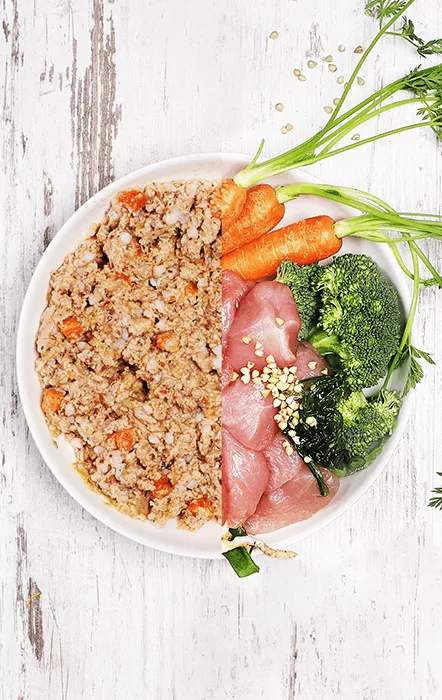 Ingredientes: carne de pollo bío 60 %, zanahoria bío 10 %, apio bío 9 %, brócoli bío 8 %, semillas de trigo sarraceno bío 4 %, minerales, cáñamo bío 1,5 %, albahaca bío, algas marinas, aceite de cáñamo bío 0,15 %.