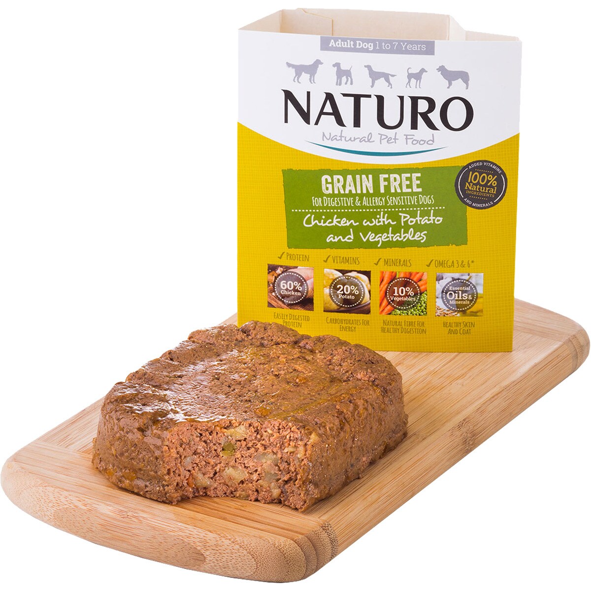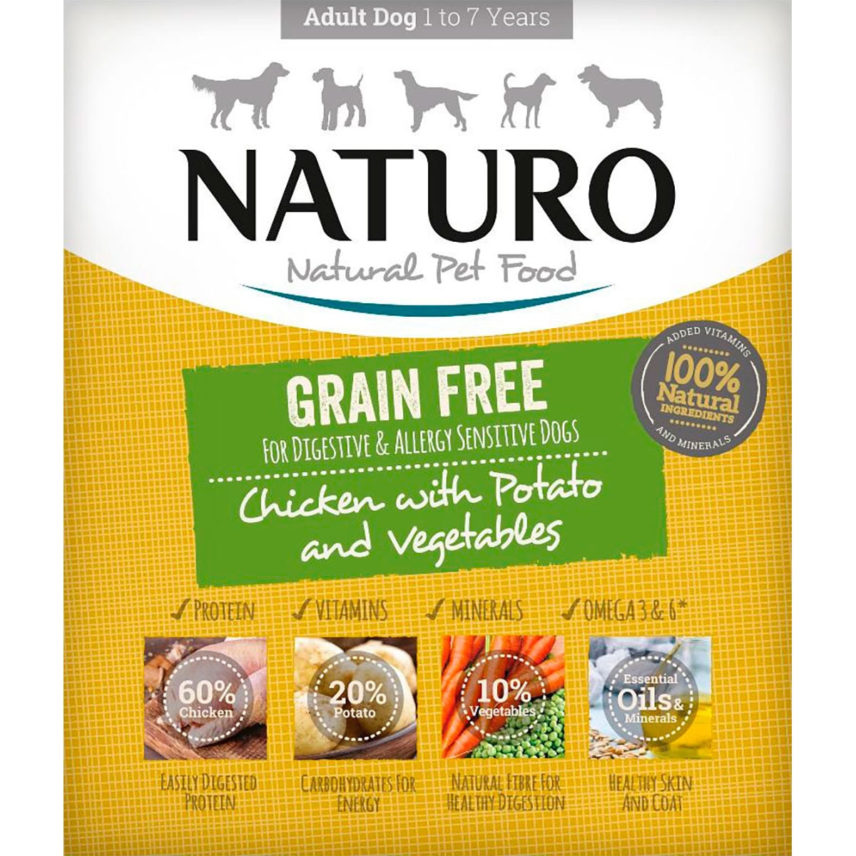 Pollo 60%, patatas 26%, zanahorias 5%, guisantes 5%, minerales, aceite de salmón, aceite de girasol, kelp seco, tomate seco, albahaca seca.