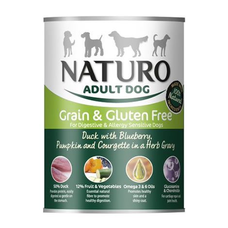 Pato 50%, arándanos azules 4%, calabaza 4%, calabacín 4%, vitaminas y minerales, aceite de girasol, aceite de salmón, aceite de linaza, kelp secada, romero seco, raíz de achicoria seca, mananoligosacáridos (MOS prebióticos), ortiga seca, té verde, rosa mosqueta seca, glucosamina, sulfato de condroitina, caléndula.