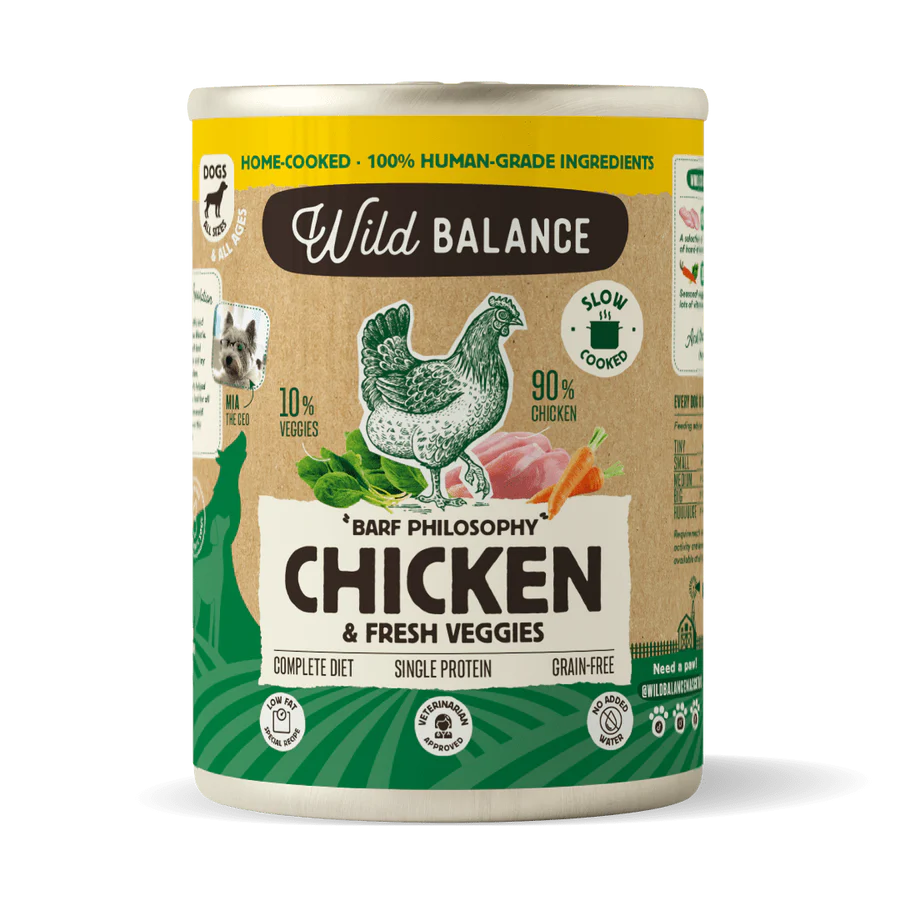 En Wild Balance somos conscientes de la importancia que tiene la alimentación para nuestros perros, por ello todas nuestras latas contienen ingredientes de calidad, con un alto porcentaje de carne y verduras (90% pollo, 10% zanahoria y espinacas), cocinados a fuego lento y con mucho amor. ¡La lata de comida cocinada para perros de pollo está para chuparse las patitas!