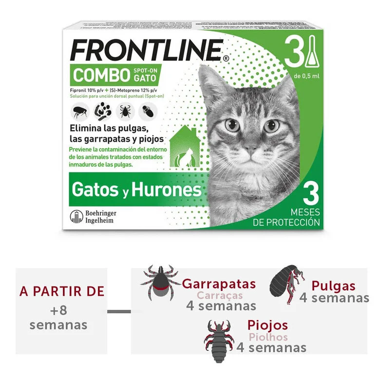 Su actividad insecticida frente a nuevas infestaciones por pulgas adultas persiste durante 4 semanas y previene la multiplicación de pulgas por inhibición del desarrollo de huevos (actividad ovicida) y de larvas y pupas (actividad larvicida). La eficacia acaricida frente a garrapatas durante 2 semanas. Después de la aplicación, Frontline Combo se difunde en las estructuras de la piel de su mascota, y cubre completamente los pelos y la piel del gato. Se almacena en las glándulas sebáceas donde forma un reservorio.