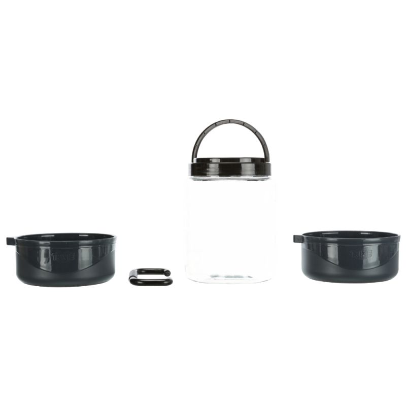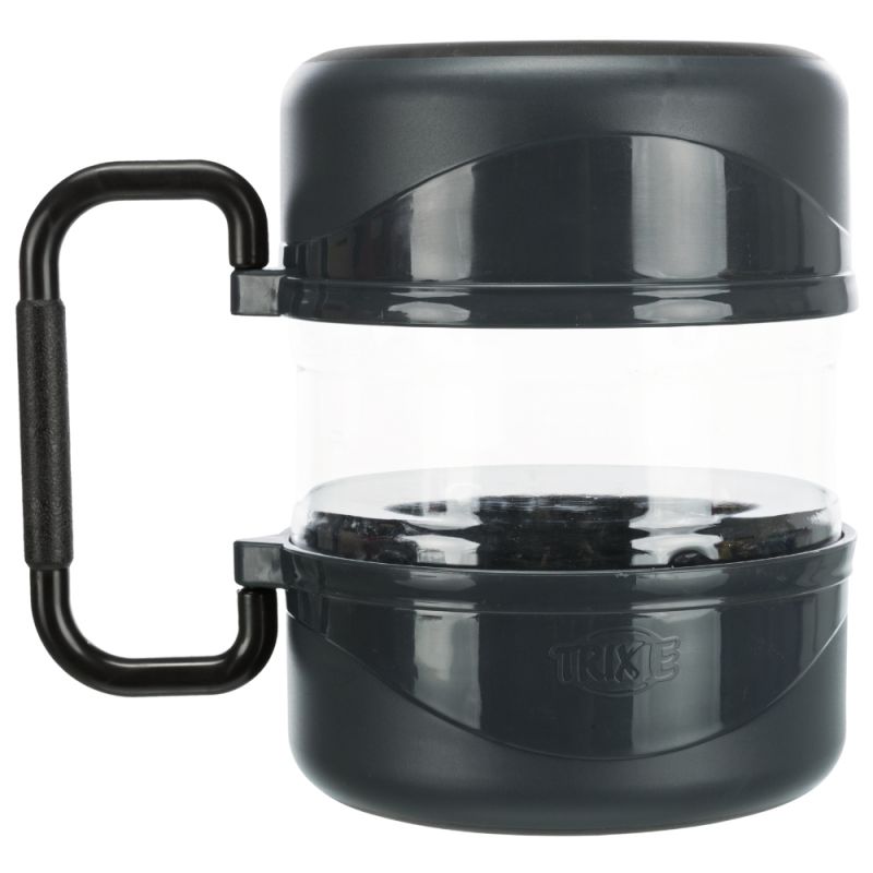 Tiene dos comederos con una capacidad de 0,75 litros que te servirán de comedero o bebedero. El recipiente para guardar la comida tiene una capacidad de 2 litros. Este recipiente tiene una tapa de rosca muy práctica y ayuda a que la comida se conserve fresca. Es, además, muy cómodo para dosificar la comida.